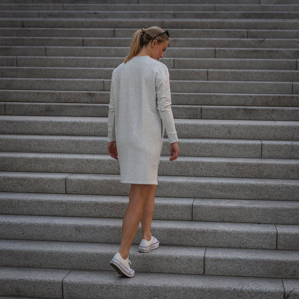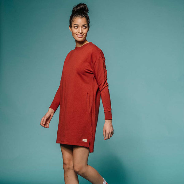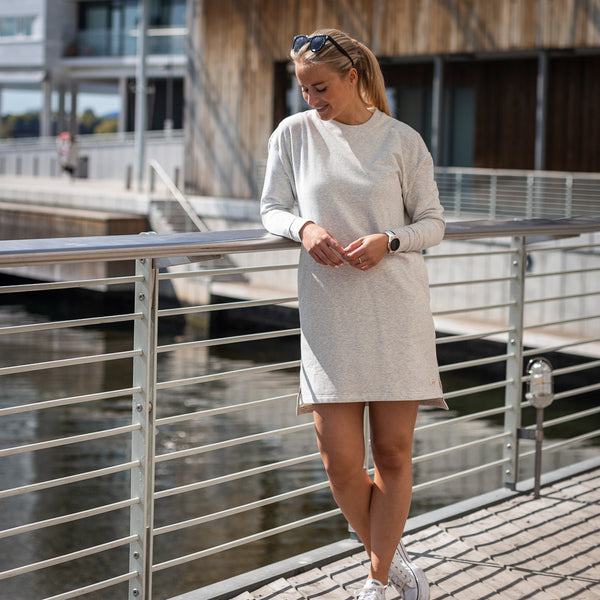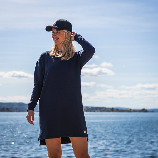 Tufte's college dress for women is the ultimate comfortable garment. Combine your dress with tights for a comfortable and sporty outfit at work or at leisure.This is a dress in a soft blend of bamboo viscose and organic cotton. The dress has a relaxed fit with a low shoulder seam and ribbed edging at the bottom of the sleeves. In the front you will find slip pockets.